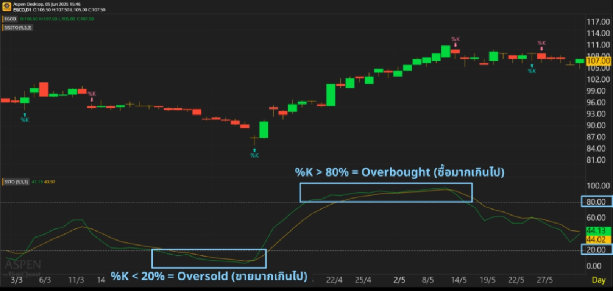 • Oversold ขายมากเกินไป: เมื่อ %K น้อยกว่า 20%