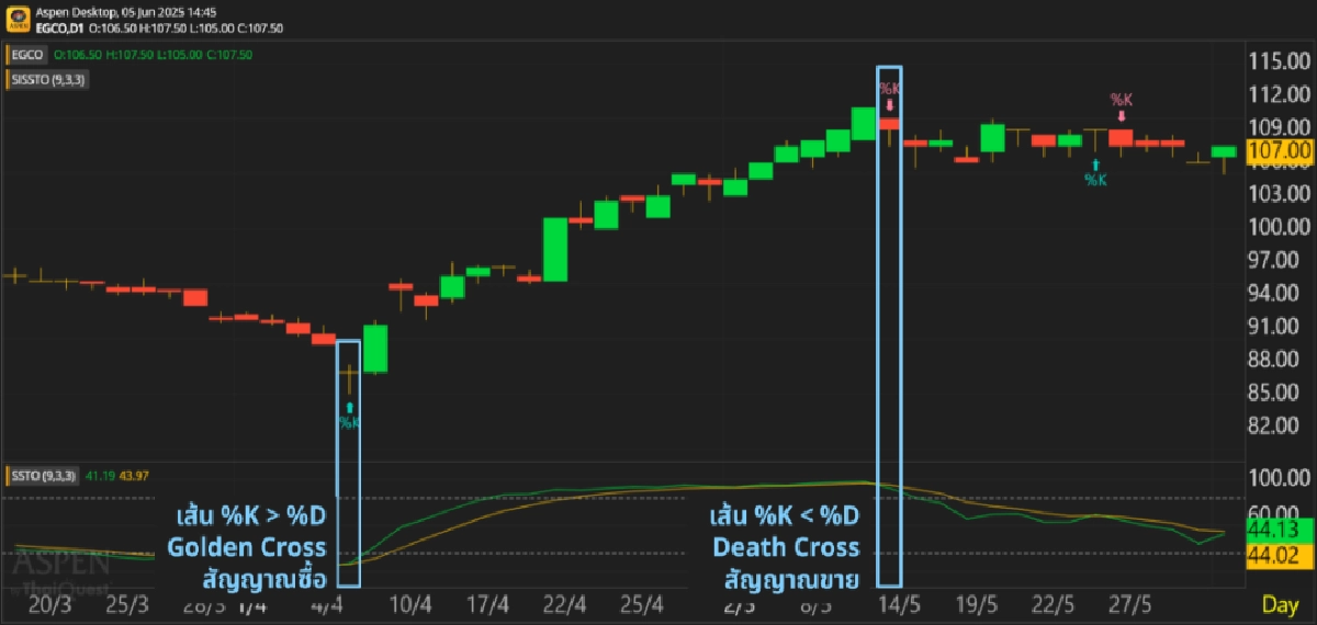 • สัญญาณขาย (Death Cross): เมื่อเส้น %K ตัดลงใต้ เส้น %D บ่งชี้ถึงโอกาสในการขายทำกำไร