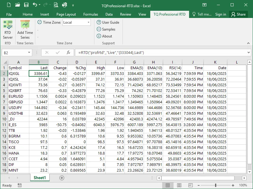 Real-Time Data (RTD): ส่งข้อมูลราคาและค่าอินดิเคเตอร์ไปยัง Microsoft Excel แบบ Real-time ผ่านฟังก์ชัน RTD ช่วยให้การวิเคราะห์ข้อมูลเป็นไปอย่างแม่นยำและต่อเนื่อง โดยไม่ต้องรีเฟรชข้อมูลด้วยตนเอง